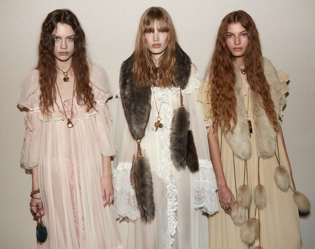 A proposito di rouches e pizzi, anche Chloé lascia il segno. La parola chiave è femminilità: seta, pizzi, pellicce, cappotti, pelle e velluto danno vita a un perfetto equilibrio tra eleganza e praticità, incarnando alla perfezione il concetto di prêt-à-porter, sempre con grande eleganza; un connubio tra lusso, semplicità e raffinatezza.